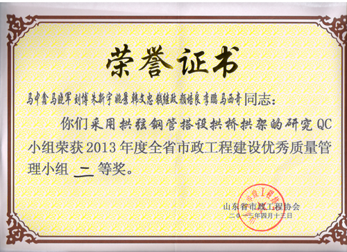 “采用拱弦鋼管搭設(shè)拱橋拱架的研究”QC小組榮獲2013年度全省市政工程建設(shè)優(yōu)秀質(zhì)量管理小組二等獎(jiǎng)