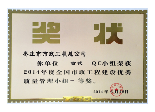 “古城”QC小組榮獲2014年度全國市政工程建設優(yōu)秀質量管理小組一等獎