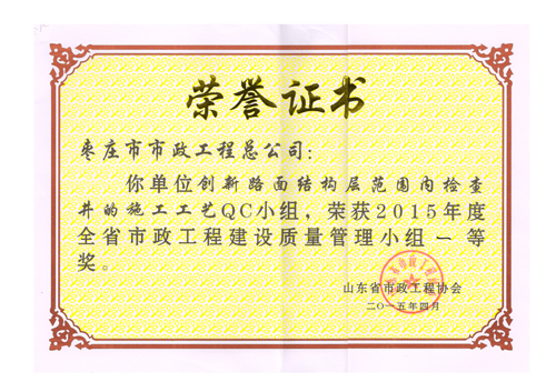“創(chuàng)新路面結(jié)構(gòu)層范圍內(nèi)檢查井的施工工藝”QC小組榮獲2015年度全省市政工程建設(shè)質(zhì)量管理小組一等獎
