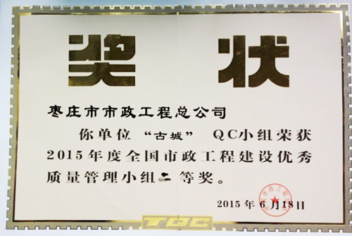 “古城”QC小組榮獲2015年度全國(guó)市政工程建設(shè)優(yōu)秀質(zhì)量管理小組二等獎(jiǎng)